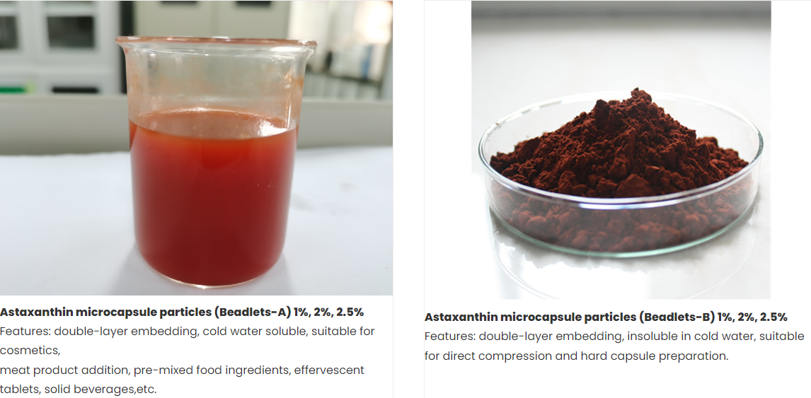 Application field At present, astaxanthin is mainly used as a functional pigment in aquaculture, food, cosmetics and other fields. and survival rate, improve health, optimize body color and meat quality. Natural astaxanthin has been used as a food additive for food coloring, preservation and nutrition enhancement. Studies have shown that astaxanthin helps keep trout fresh. In recent years, with the continuous deepening of astaxanthin biological function research and pharmacological efficacy experiments, astaxanthin has been widely used in the prevention and treatment of cardiovascular diseases, cancer, metabolic syndrome, diabetes, neurodegenerative diseases, ophthalmic diseases, skin diseases and other diseases. It has attracted great attention from the scientific community because of its excellent effect, which shows that astaxanthin has great potential application value and broad development prospects in the fields of medicine and health care products. |